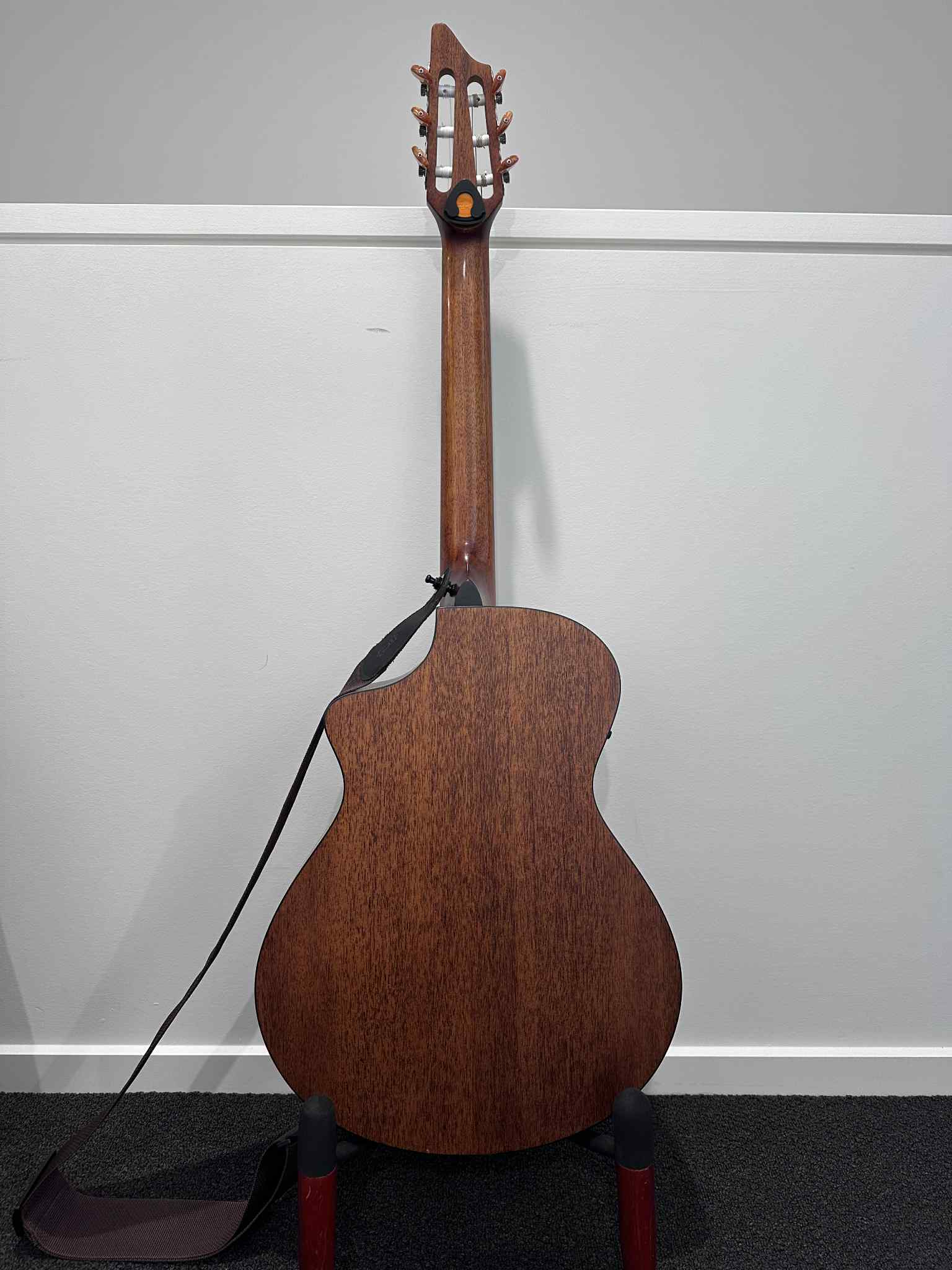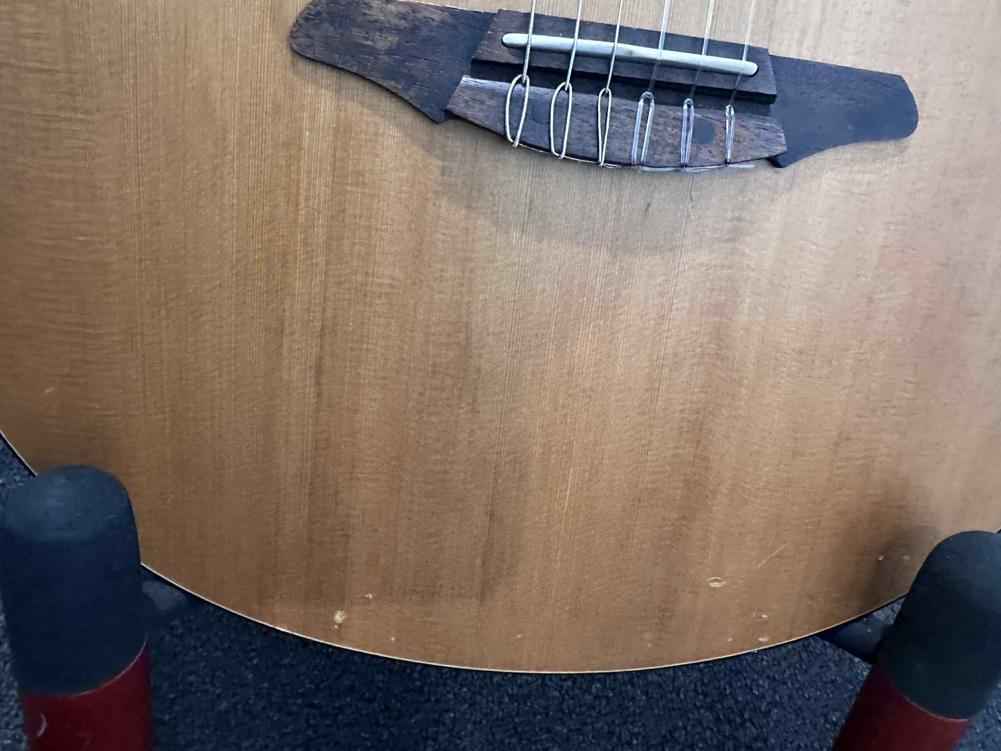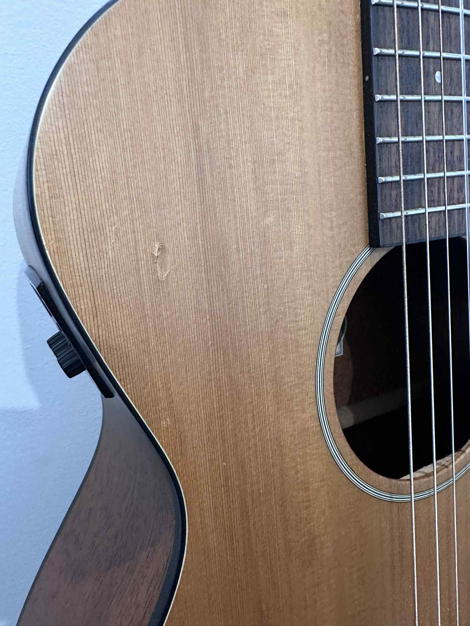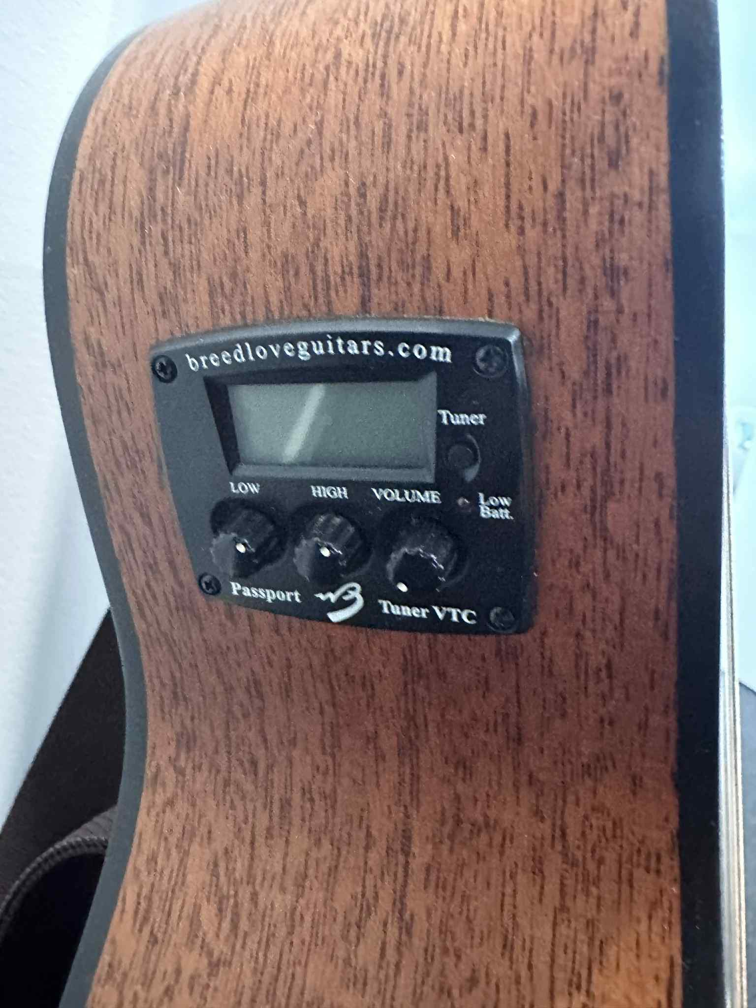 Classical Nylon Crossover Guitar Breedlove Atlas Series - Passport N250/CMe Top: Solid Red Cedar Back and Sides: Laminated Ovangkol Fingerboard & Bridge: Rosewood Nut Width: 47mm Tuners: 18:1 Ratio - Chrome with Fire Burst Pearloid buttons Electronics: Passport Series VTC active pickup by LR Baggs Case: Hardfoam bag String: D'Addario Pro-Arte Normal Tension You can see the blemishes on the top finish, they don't affect the sound and tone. I call them battle scars.